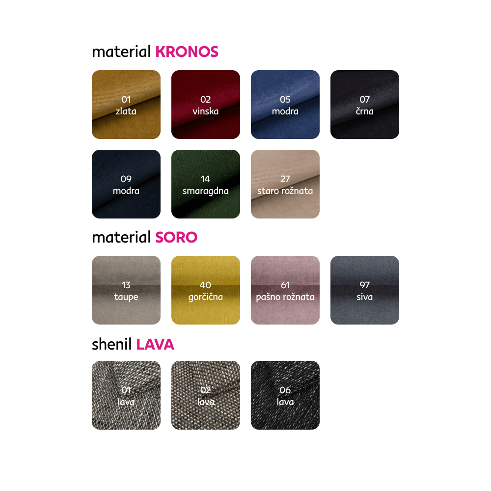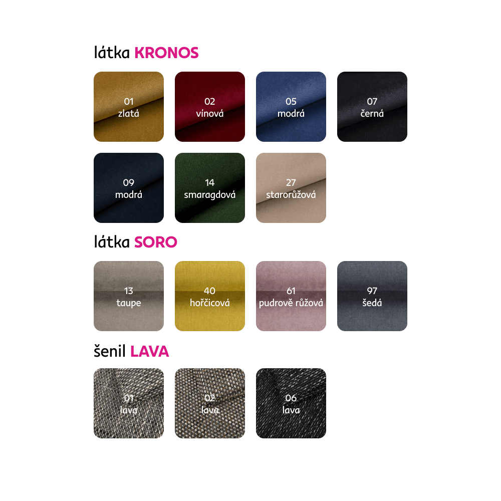 Možnosť objednať kreslo CUBA aj v látke Savana, Kronos, Soro a Lava za cenu 125 Eur, v látke Coral Boucle za cenu 119 Eur, v mikrofáze za cenu 109 Eur, v ekokoži a v kombinácii ekokoža+látka Lava za cenu 129 Eur. Pri individuálnej objednávke je potrebné zaplatiť 20 % zálohu z danej sumy. Po uhradení zálohy bude Vaša požiadavka zadaná do výroby. Doba dodania 6 – 8 týždňov.