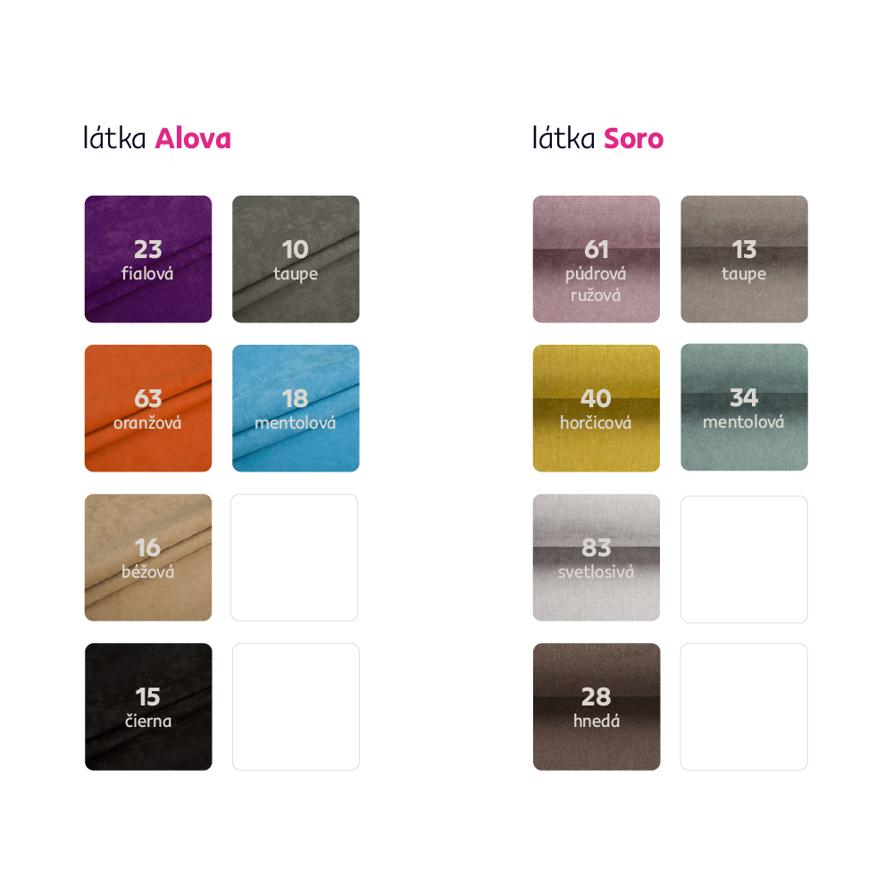 Možnosť objednania v 6 farebných prevedeniach látky Alova v cene 275 Eur alebo látky Soro v cene 309 Eur a v 4 farebných prevedeniach látky Coral v cene 319 Eur. Pri individuálnej objednávke je potrebné zaplatiť 20% zálohu z danej sumy. Po uhradení zálohy bude Vaša požiadavka zadaná do výroby. Dodacia lehota 6-8 týždňov.