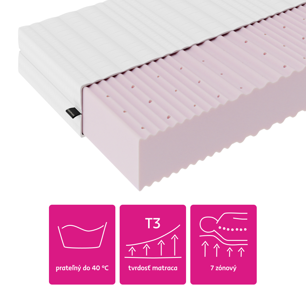 Farba peny a prešívanie poťahu matraca sa môžu mierne líšiť od vyobrazenia. Tieto vizuálne rozdiely nemajú žiadny vplyv na funkčné vlastnosti, komfort ani kvalitu matraca. Matrac je vákuovo balený a rolovaný, preto ho po jeho rozbalení odporúčame nechať na rovnom podklade 24-48 hodín v pokoji (nepoužívať a nezaťažovať), aby zregeneroval na deklarovanú výšku.