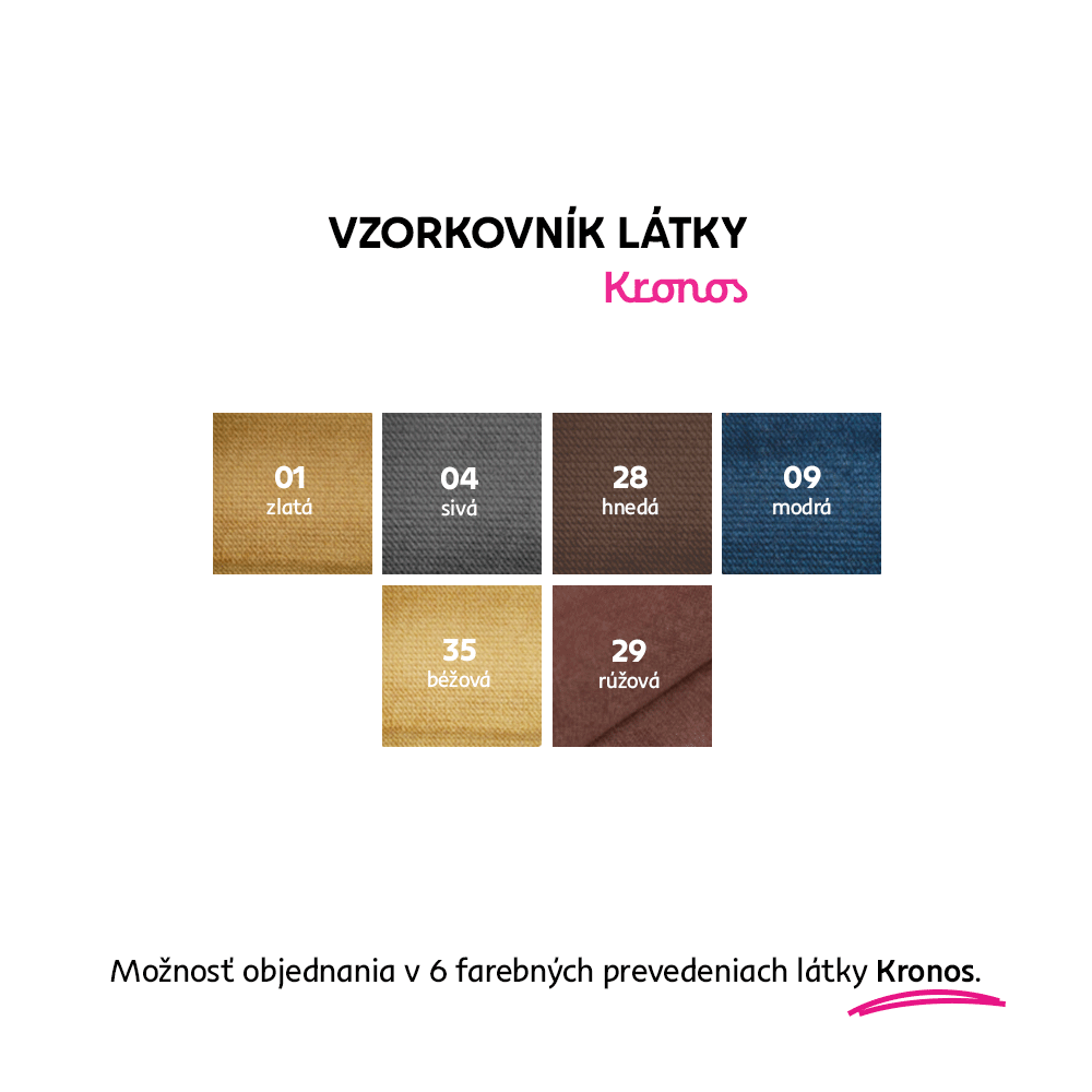 Možnosť objednania v 6 farebných prevedeniach látky Kronos. Pri individuálnej objednávke je potrebné zaplatiť 10% zálohu z danej sumy. Po uhradení zálohy bude Vaša požiadavka zadaná do výroby. Doba dodania 8-10 týždňov.