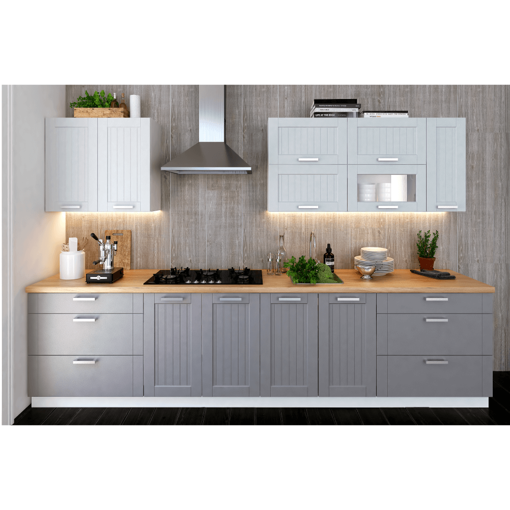 Skrinky sú dodávané bez pracovnej dosky. Pracovnú dosku v prevedení gold craft oak v hrúbke 38 mm je možné doobjednať v cene 39 Eur/1 bm.